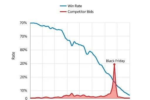 What this means for your win rate During these peak periods, the bids of your competitors are skyrocketing. Even if you maintain your normal bids, your win rate will drop like a brick. The inventory is the same but the competition is now far more aggressive.